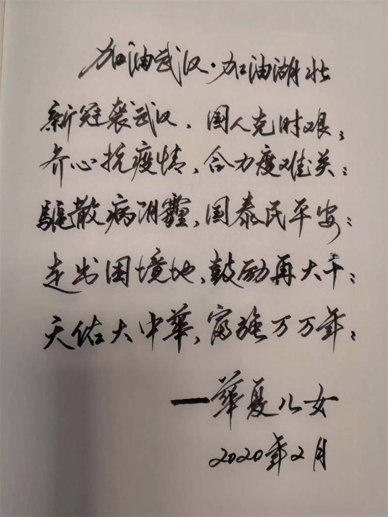 紙短情長述不盡心中敬意,以詩傳情道不盡心中謝意,詩詞歌賦雖不能驅(qū)散冠狀病毒,但能帶給人們百折不撓的勇氣和必勝的信心。以筆為槍能“齊心抗疫情,合力度難關(guān)”,以詩傳情能“驅(qū)散病陰霾,國泰民平安”,以筆墨應援能用筆觸的溫度,溫暖那些戰(zhàn)役中英雄。