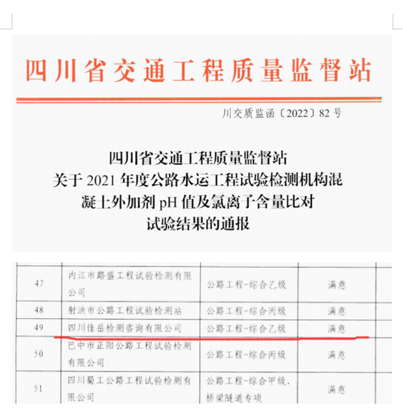 5月11日,四川省交通工程質(zhì)量監(jiān)督站印發(fā)《關(guān)于2021年度公路水運(yùn)工程試驗(yàn)檢測機(jī)構(gòu)混凝土外加劑PH值及氯離子含量比對試驗(yàn)結(jié)果的通報(bào),交建集團(tuán)四川佳岳檢測咨詢有限公司獲得“滿意”評價。