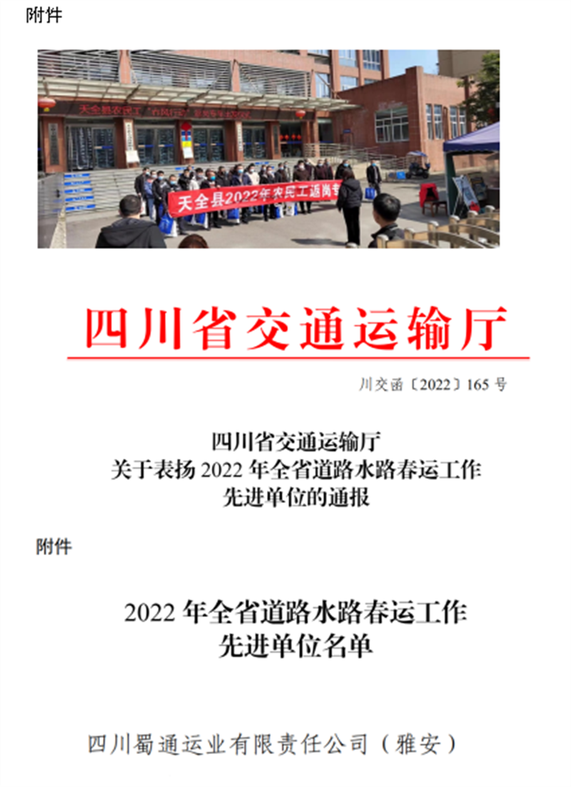 蜀通公司認(rèn)真落實(shí)各級(jí)政府和行業(yè)主管部門有關(guān)春運(yùn)工作的安排部署,堅(jiān)持以“冬安行動(dòng)”為抓手,全力以赴做好春運(yùn)期間運(yùn)輸安全和疫情防控,確保全市交通運(yùn)輸暢通、民生出行順利。2022年春運(yùn)期間,共投入班線車輛16546臺(tái),發(fā)班21269班次,其中加班422班次,安全運(yùn)送旅客26余萬人次,圓滿完成2022年春運(yùn)工作,被四川省交通運(yùn)輸廳評(píng)為“2022年全省道路水路春運(yùn)工作先進(jìn)單位”。
