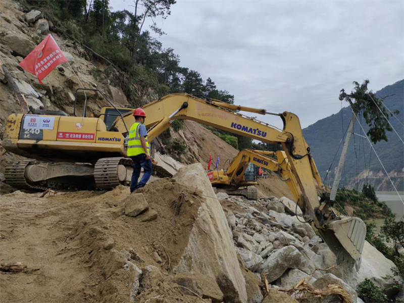 搶險(xiǎn)隊(duì)伍,馬上出發(fā)!集團(tuán)領(lǐng)導(dǎo)班子立即召開碰頭會(huì),分析研判形勢(shì),安排部署工作,密切關(guān)注震區(qū)態(tài)勢(shì),成立抗震救災(zāi)領(lǐng)導(dǎo)小組,副總經(jīng)理鐘焱宇率現(xiàn)場(chǎng)指揮組趕赴石棉靠前指揮搶險(xiǎn)救災(zāi)。正在石棉G108線施工的康藏路橋公司項(xiàng)目部組成10人搶險(xiǎn)救援小分隊(duì),攜帶挖掘機(jī)4臺(tái)、拖車4臺(tái)、裝載機(jī)3臺(tái)、交通運(yùn)輸車2輛、無人機(jī)1臺(tái),第一時(shí)間到就地?fù)岆U(xiǎn)工作,震后7小時(shí),完成國道G108線馬富至菩薩崗約40公里路段、6處塌方點(diǎn)1600余方土石方清理,爾后轉(zhuǎn)戰(zhàn)石棉縣新民鄉(xiāng)進(jìn)行通鄉(xiāng)道路搶通作業(yè)。