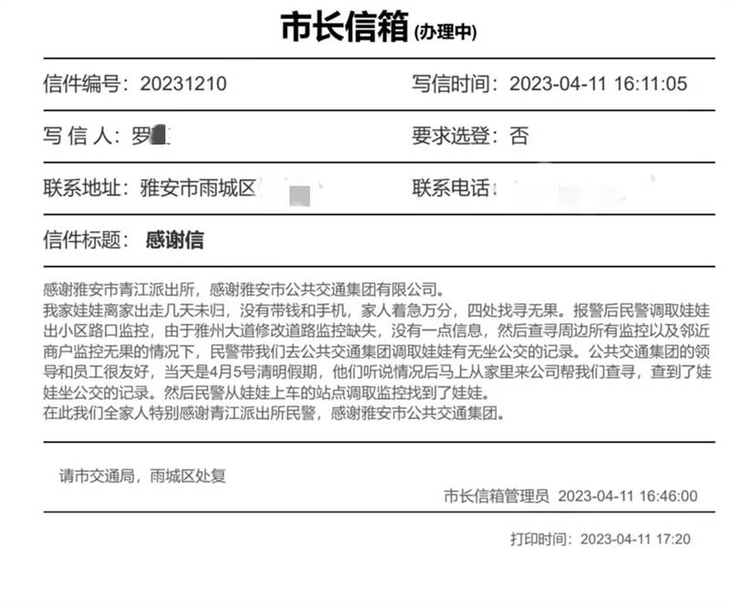 日前,市民羅女士的孩子離家出走,四處尋找無(wú)果。4月5日,時(shí)值清明假期,羅女士來(lái)到公交集團(tuán),希望工作人員幫忙查詢孩子乘坐公交車的記錄。得知情況后,公交集團(tuán)值班人員立即通知相關(guān)技術(shù)人員到崗到位,根據(jù)羅女士提供的戶口簿信息,通過后臺(tái)查詢到孩子使用學(xué)生卡在市區(qū)乘坐公交車的記錄及相關(guān)車輛的監(jiān)控視頻,并會(huì)同公安干警完整梳理出孩子的活動(dòng)軌跡,不到半個(gè)小時(shí),成功協(xié)助家長(zhǎng)找到離家出走的孩子。事后羅女士帶著感恩之情和禮物,專程到公交集團(tuán)表示感謝,公交集團(tuán)工作人員婉言謝絕了羅女士的禮物。隨后,羅女士在市長(zhǎng)信箱寫下了這封誠(chéng)摯的感謝信。