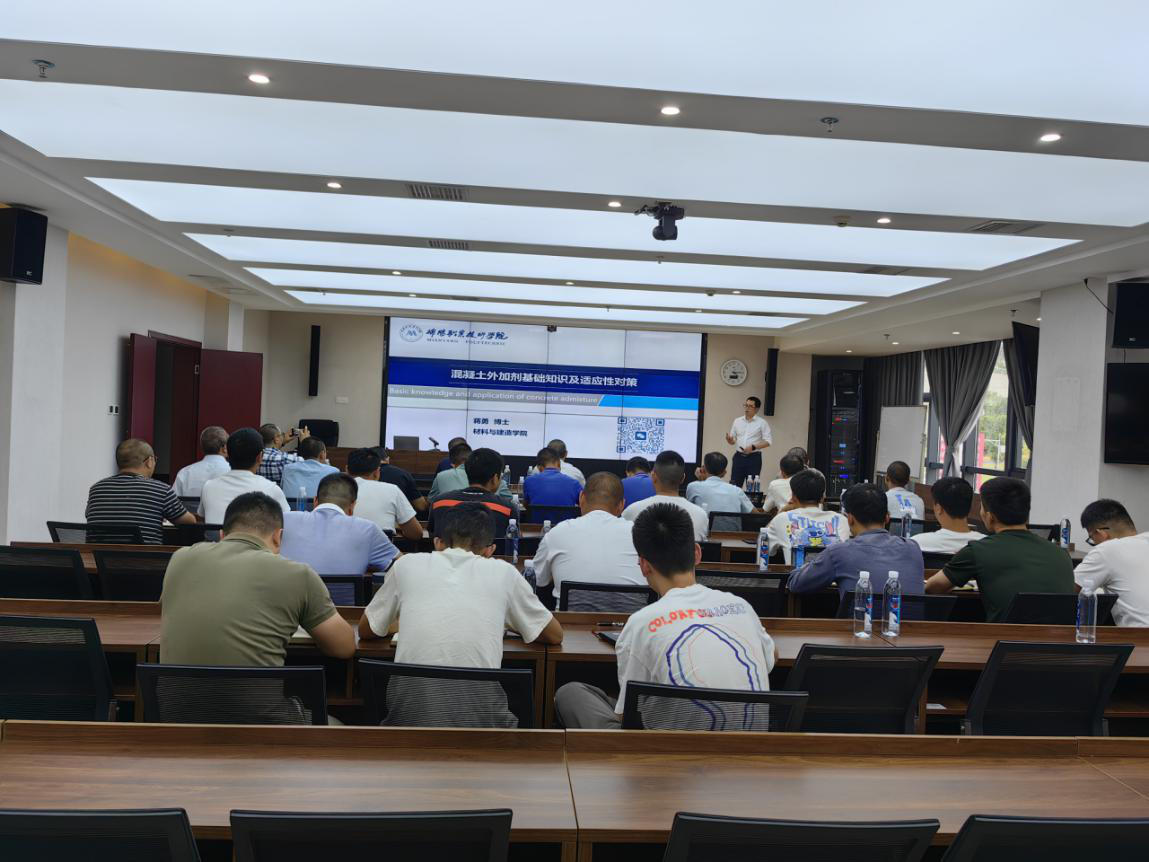 培訓邀請綿陽職業(yè)技術學院材料與建造學院院長賈陸軍、蔣勇兩位博士授課,重點圍繞配合比設計中需注意的事項展開,詳細講解配合比設計要點,分析原材料選擇及礦粉、粉煤灰摻合料摻配比例的重要性,總結交流機制砂在混凝土中的應用技術,講解混凝土外加劑基礎知識、分析目前外加劑在使用過程中適應性問題和原因,通過真實案例分析混凝土質(zhì)量問題的原因及管控要點等。