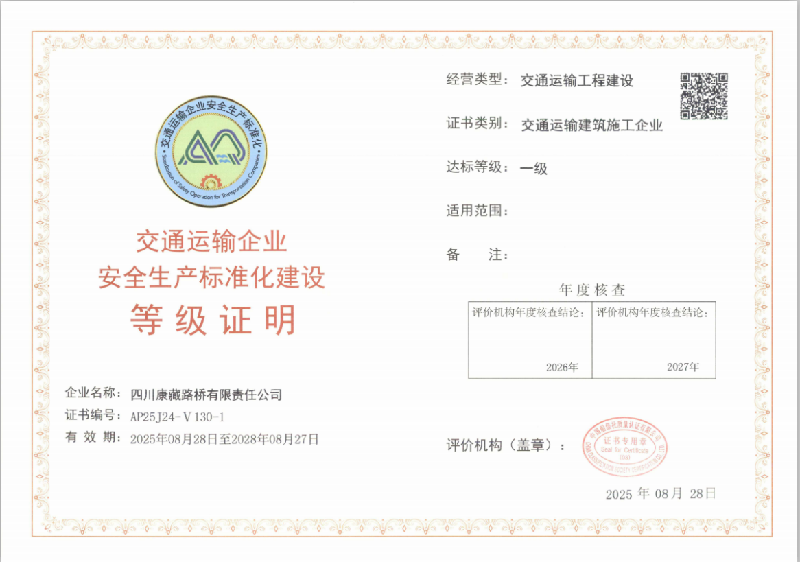 近日,經交通運輸部交通運輸企業(yè)安全生產標準化評價機構綜合評定,康藏路橋公司獲評安全標準化一級企業(yè)并取得證書,標志其安全生產管理體系獲國家最高標準認可。
