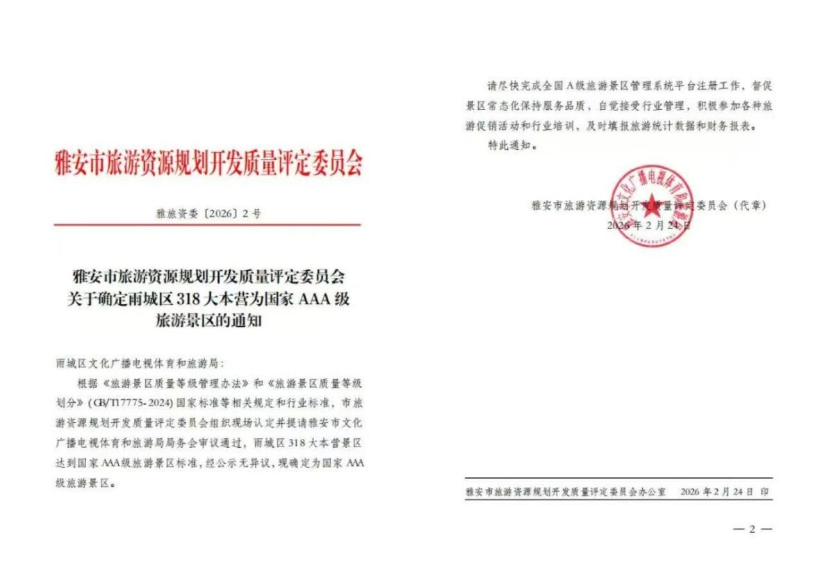 2月24日,經雅安市文化廣播電視體育和旅游局局務會審議通過,中國·雅安318自駕大本營正式被確定為國家AAA級旅游景區(qū)。