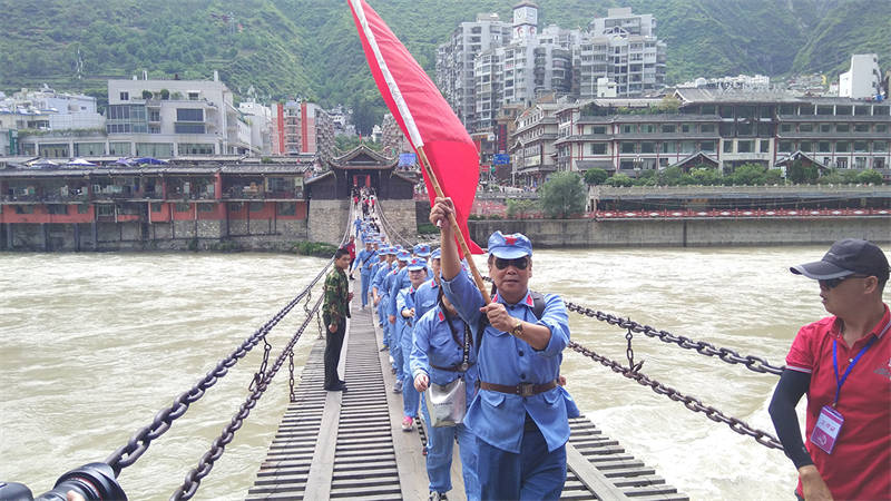 活動(dòng)中,全體黨員干部職工換上紅軍服、戴上紅軍帽,走上瀘定橋,觸摸著沾染了無(wú)數(shù)革命烈士鮮血的鐵索,瞬間將大家的思緒拉回到1935年的5月29日,22名勇士冒著敵人的槍林彈雨,攀著鐵鏈沖向?qū)Π,英勇奪下瀘定橋,取得長(zhǎng)征中的一次決定性勝利場(chǎng)景。大家無(wú)不被革命先輩的英勇與無(wú)畏所震撼。