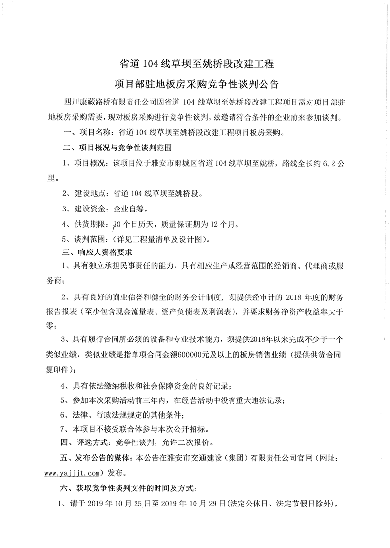 四川康藏路橋有限責(zé)任公司省道104線草壩至姚橋段改建工程項(xiàng)目部駐地板房采購競爭性談判公告