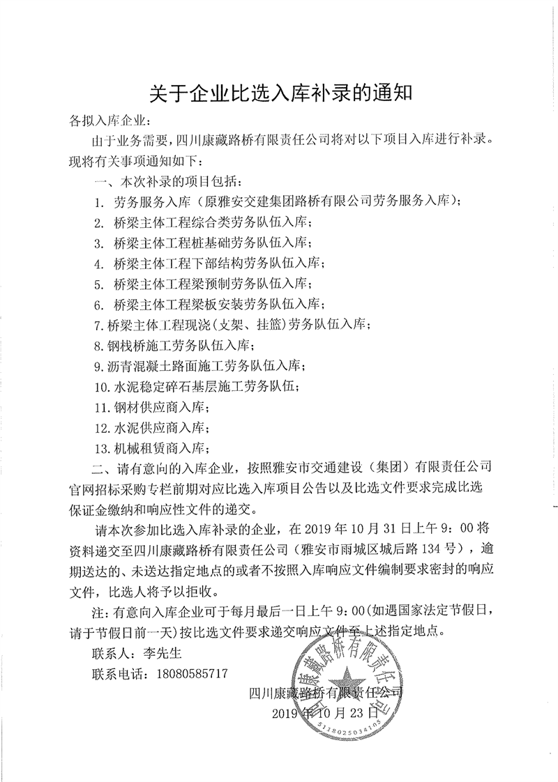 四川康藏路橋有限責任公司關于企業(yè)比選入庫補錄的通知
