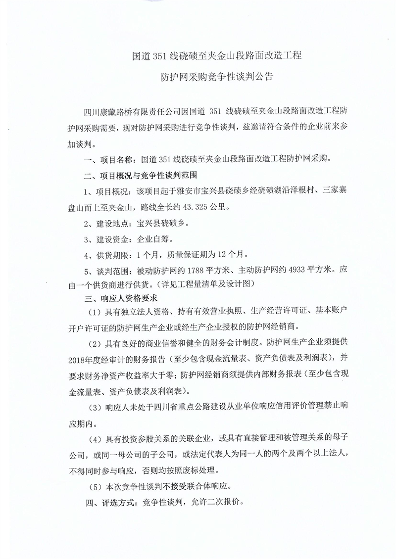 四川康藏路橋有限責(zé)任公司國(guó)道351線磽磧至夾金山段路面改造工程防護(hù)網(wǎng)采購競(jìng)爭(zhēng)性談判公告