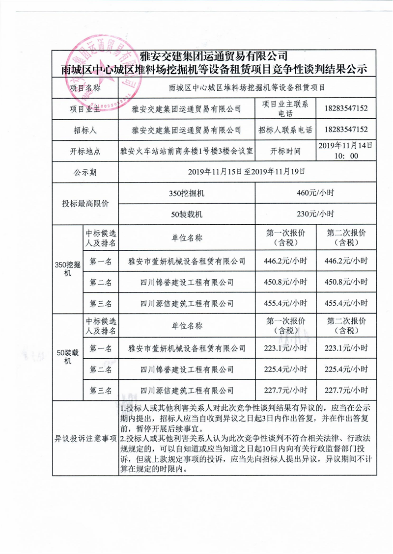 雅安交建集團(tuán)運(yùn)通貿(mào)易有限公司雨城區(qū)中心城區(qū)堆料場(chǎng)挖掘機(jī)等設(shè)備租賃項(xiàng)目競(jìng)爭(zhēng)性談判結(jié)果公示