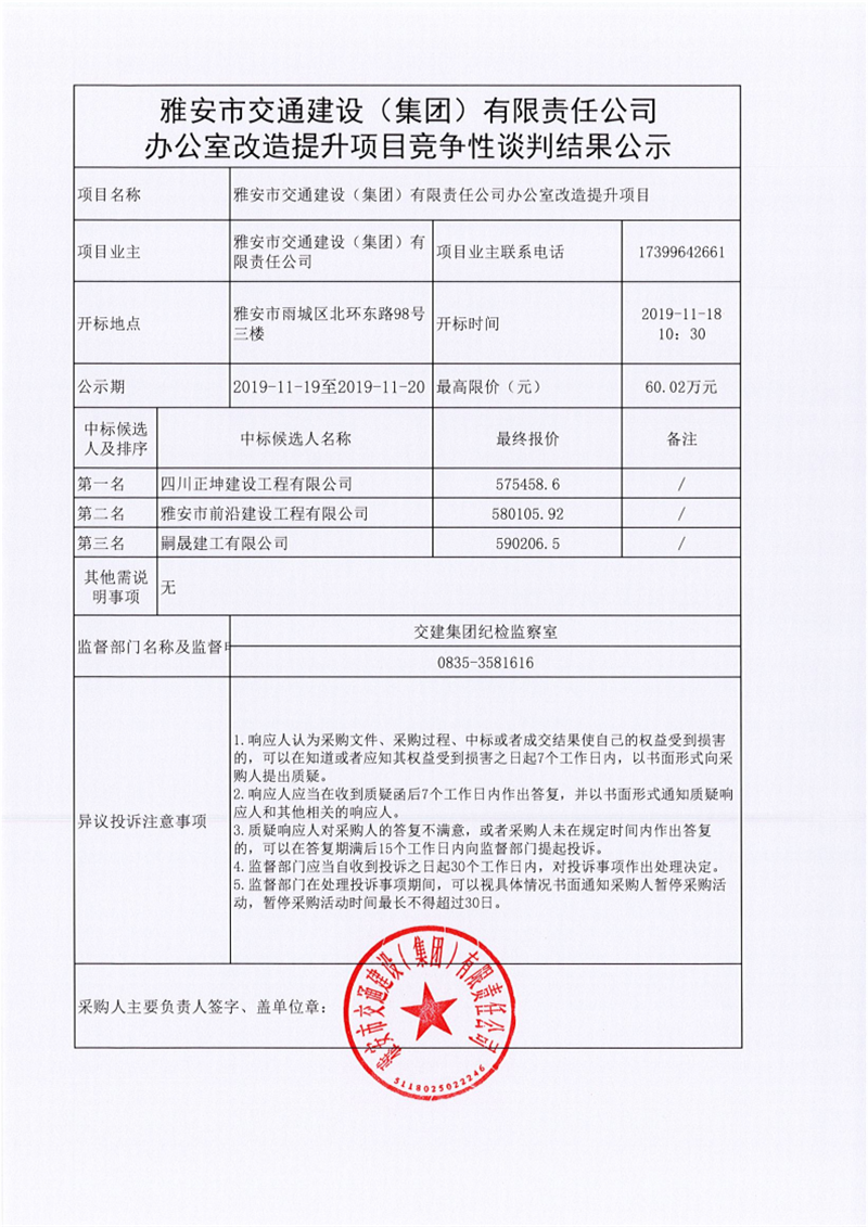 雅安市交通建設(shè)(集團)有限責任公司辦公室改造提升項目競爭性談判結(jié)果公示