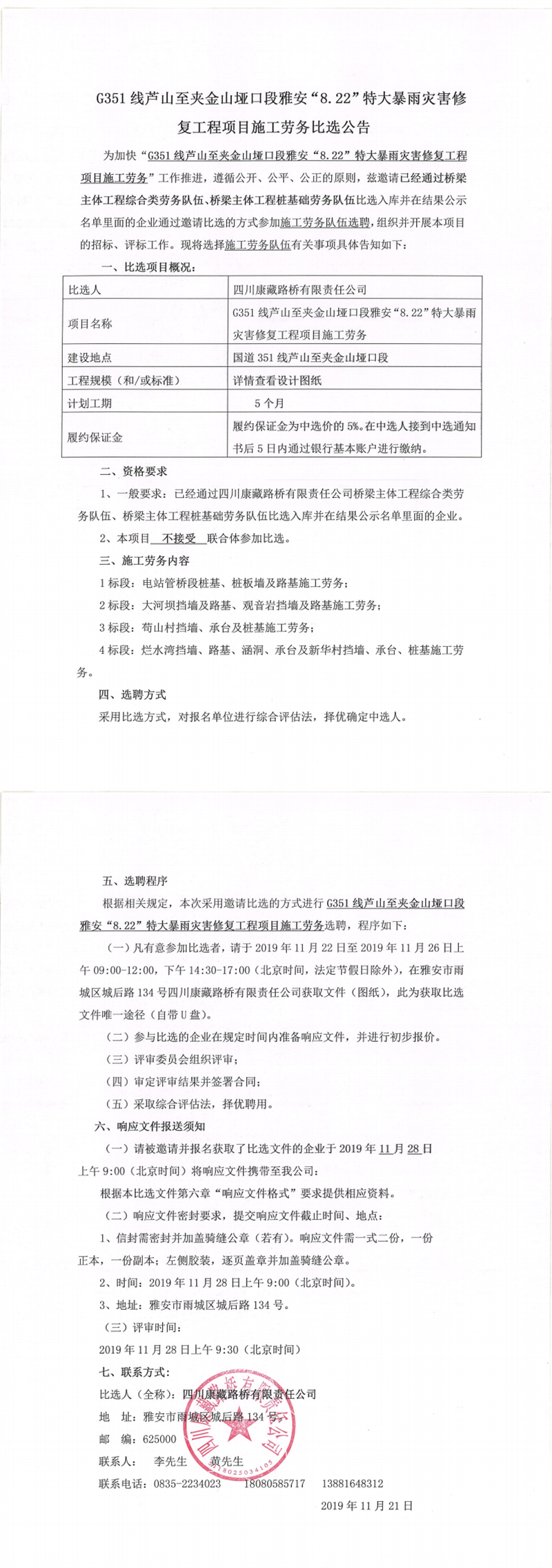 四川康藏路橋有限責(zé)任公司G351線蘆山至夾金山埡口段雅安“8.22”特大暴雨災(zāi)害修復(fù)工程項(xiàng)目施工勞務(wù)比選公告