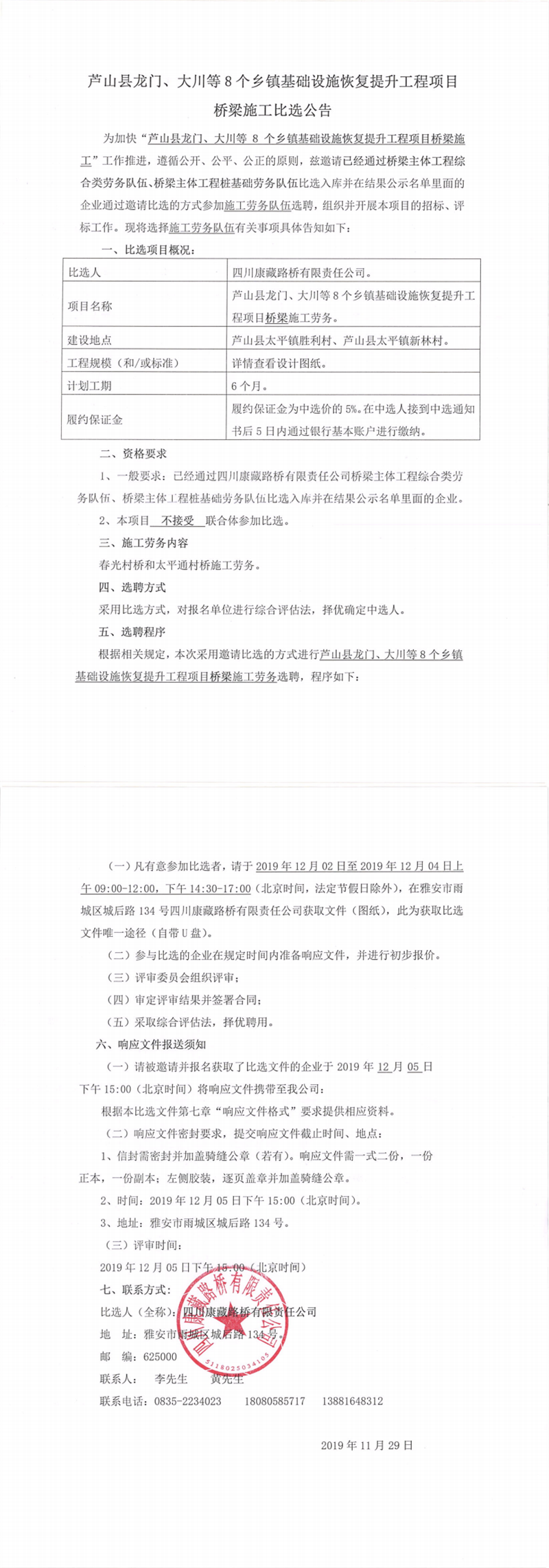 四川康藏路橋有限責任公司蘆山縣龍門、大川等8個鄉(xiāng)鎮(zhèn)基礎設施恢復提升工程項目橋梁施工比選公告