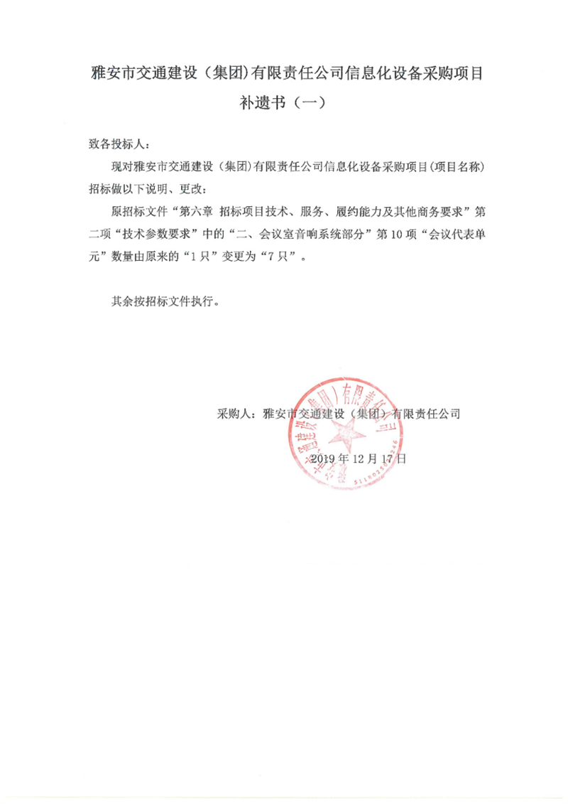 雅安市交通建設(shè)(集團)有限責(zé)任公司信息化設(shè)備采購項目補遺書(一)