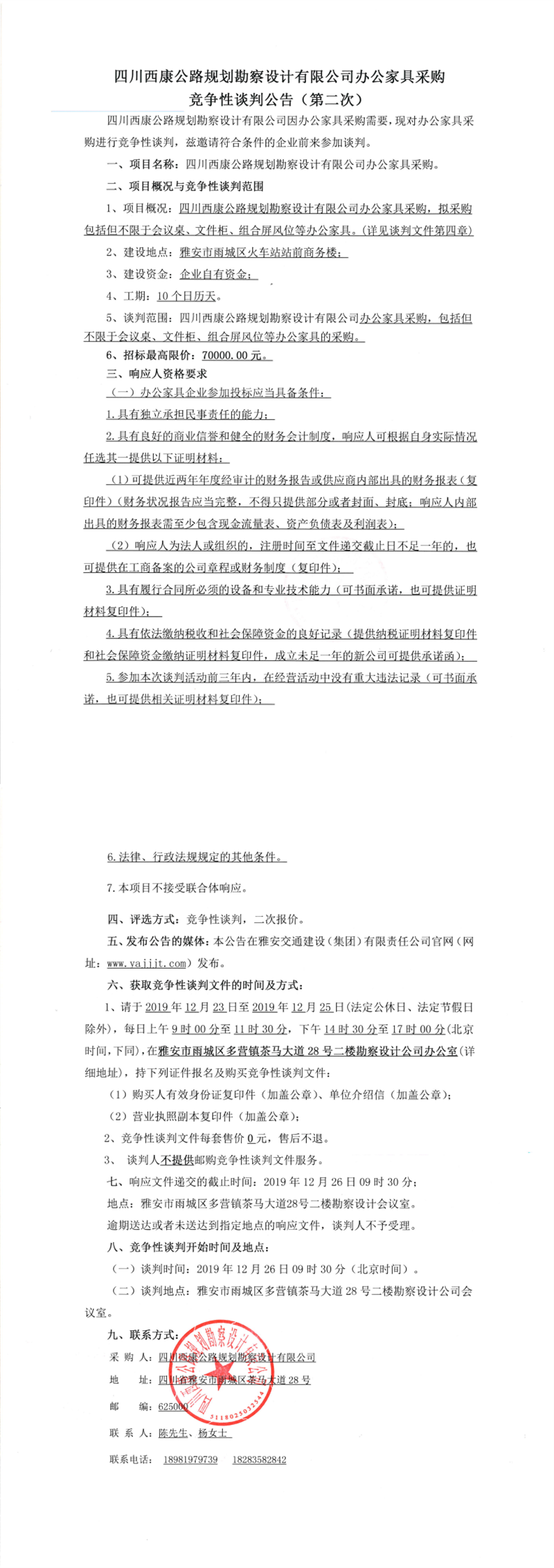 四川西康公路規(guī)劃勘察設(shè)計有限公司辦公家具采購競爭性談判公告(第二次)