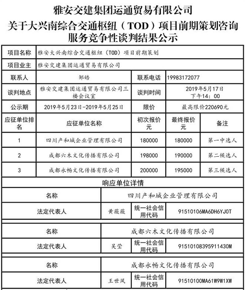 雅安交建集團(tuán)運通貿(mào)易有限公司關(guān)于大興南綜合樞紐(TOD)項目前期策劃咨詢服務(wù)競爭性談判結(jié)果公司