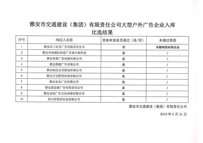 雅安市交通建設(集團)有限責任公司大型戶外廣告企業(yè)入庫比選結(jié)果