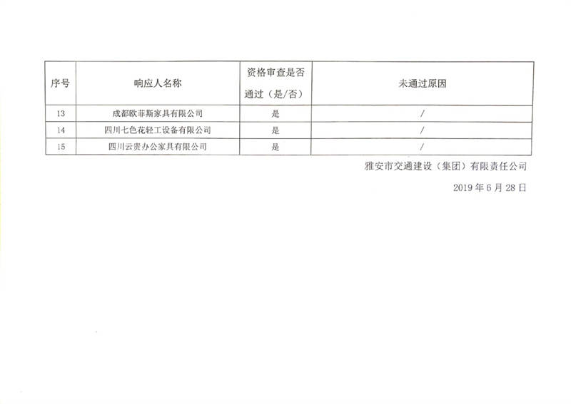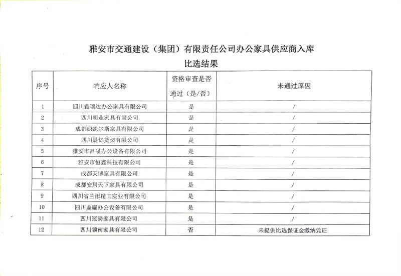雅安市交通建設(shè)(集團(tuán))有限責(zé)任公司辦公家具供應(yīng)商入庫(kù)比選結(jié)果