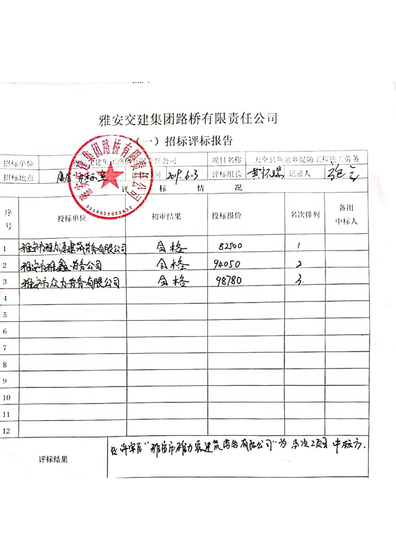雅安交建集團路橋有限責任公司天全縣魚泉鄉(xiāng)堤防工程施工勞務項目邀請招標結(jié)果公示