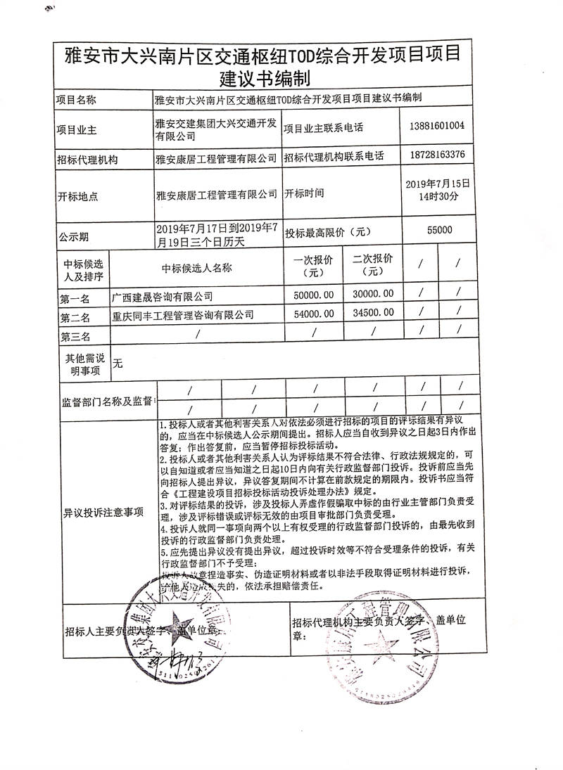 雅安交建集團(tuán)大興交通開發(fā)有限公司雅安市大興南片區(qū)交通樞紐TOD綜合開發(fā)項(xiàng)目項(xiàng)目建議書編制競爭性談判結(jié)果公示