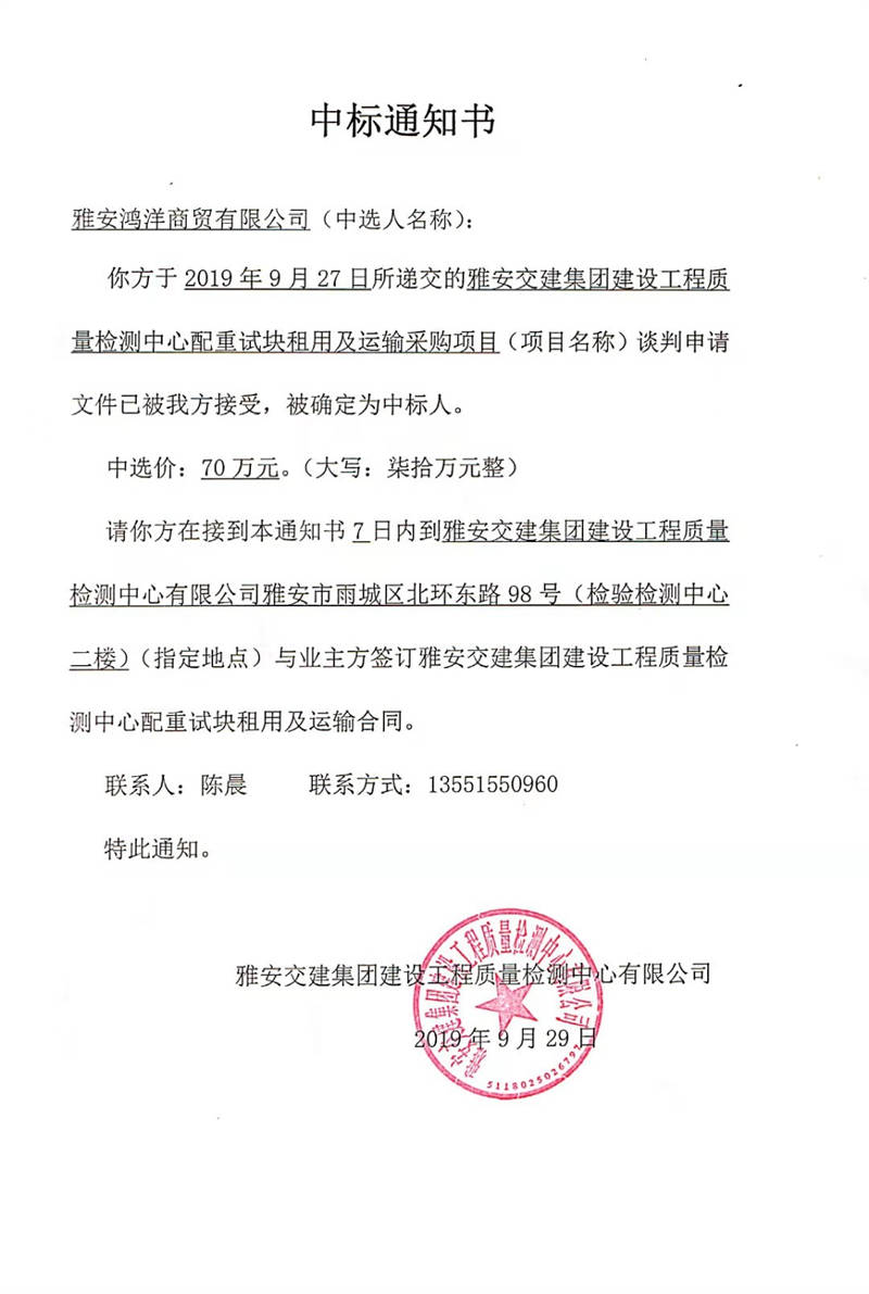 雅安交建集團建設(shè)工程質(zhì)量檢測中心配重試塊租用及運輸采購項目中標(biāo)公示