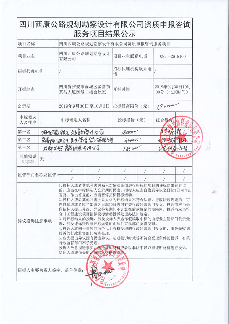 四川西康公路規(guī)劃勘察設(shè)計(jì)有限公司資質(zhì)申報咨詢服務(wù)項(xiàng)目結(jié)果公示