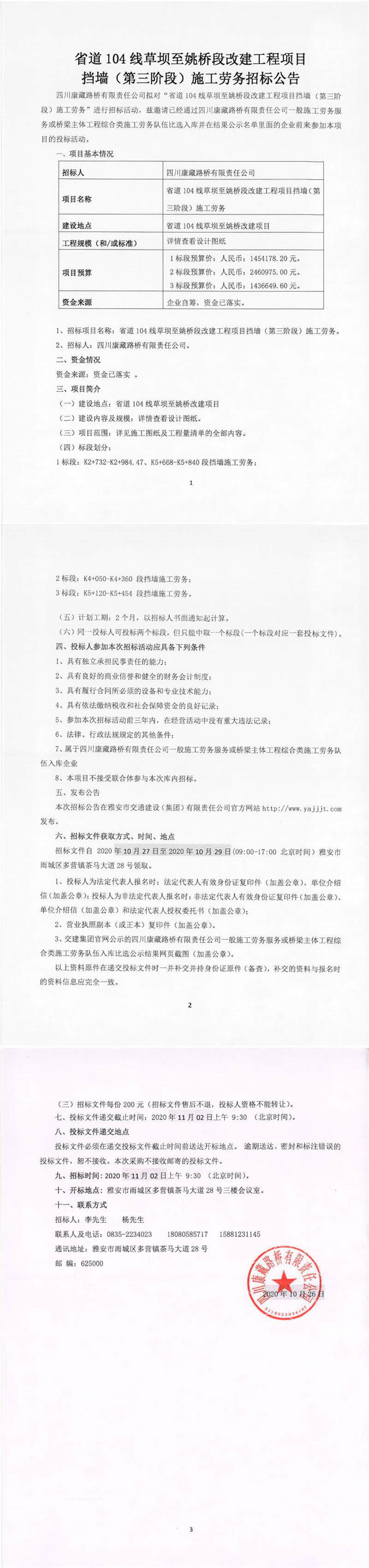 四川康藏路橋有限責任公司省道104線草壩至姚橋段改建工程項目擋墻(第三階段)施工勞務(wù)招標公告