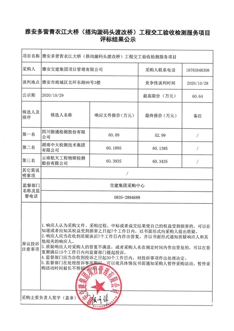 雅安交建集團(tuán)項(xiàng)目管理有限公司雅安多營(yíng)青衣江大橋(搭溝漩碼頭渡改橋)工程交工驗(yàn)收檢測(cè)服務(wù)項(xiàng)目評(píng)標(biāo)結(jié)果公示
