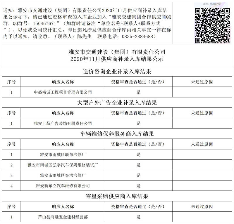 雅安市交通建設(集團)有限責任公司2020年11月供應商補錄入庫結果公示