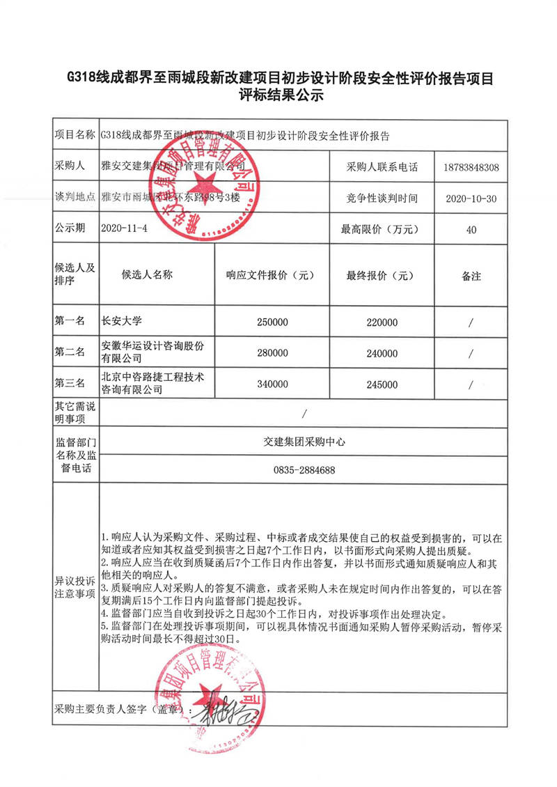 雅安交建集團(tuán)項(xiàng)目管理有限公司G318線(xiàn)成都界至雨城段新改建項(xiàng)目初步設(shè)計(jì)階段安全性評(píng)價(jià)報(bào)告項(xiàng)目評(píng)標(biāo)結(jié)果公示