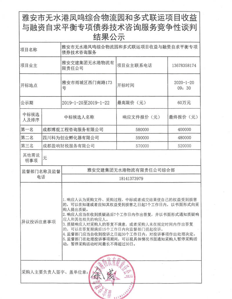 雅安市無水港鳳鳴綜合物流園和多式聯運項目收益與融資自求平衡專項債券技術咨詢服務競爭性談判結果公示