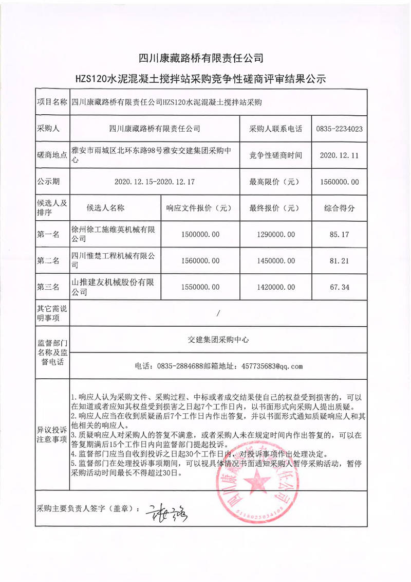 四川康藏路橋有限責(zé)任公司HZS120水泥混凝土攪拌站采購競爭性磋商結(jié)果公示