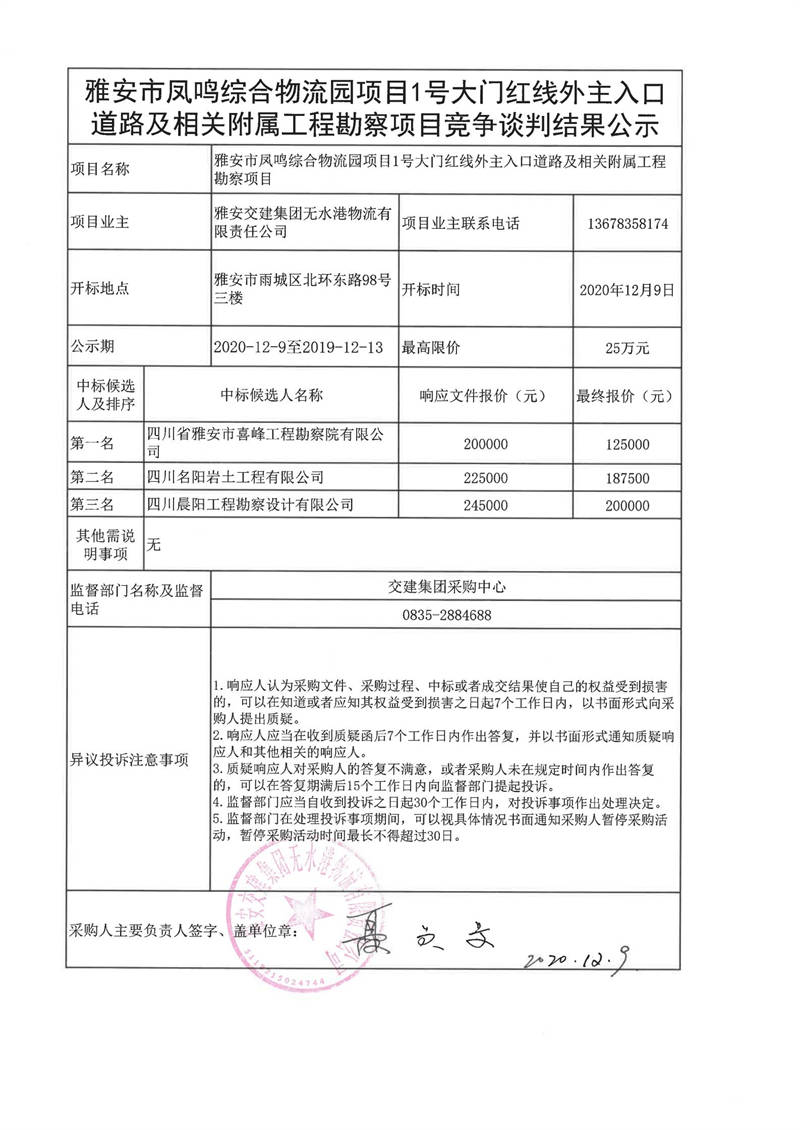 雅安交建集團(tuán)無水港物流有限責(zé)任公司雅安市鳳鳴綜合物流園項(xiàng)目1號(hào)大門紅線外主入口道路及相關(guān)附屬工程勘察項(xiàng)目競爭談判結(jié)果公示