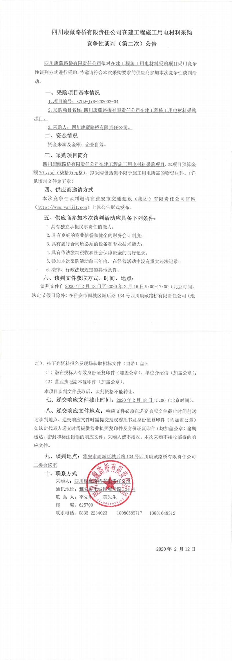 四川康藏路橋有限責任公司在建工程施工用電材料采購競爭性談判(第二次)公告