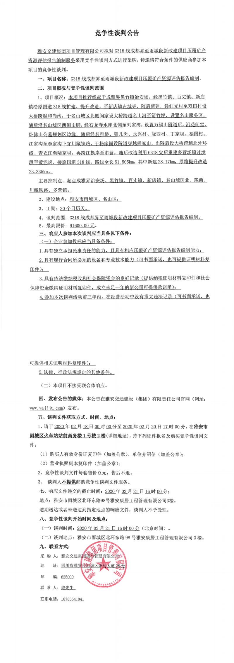 雅安交建集團項目管理有限公司G318線成都界至雨城段新改建項目壓覆礦產資源評估報告編制競爭性談判公告