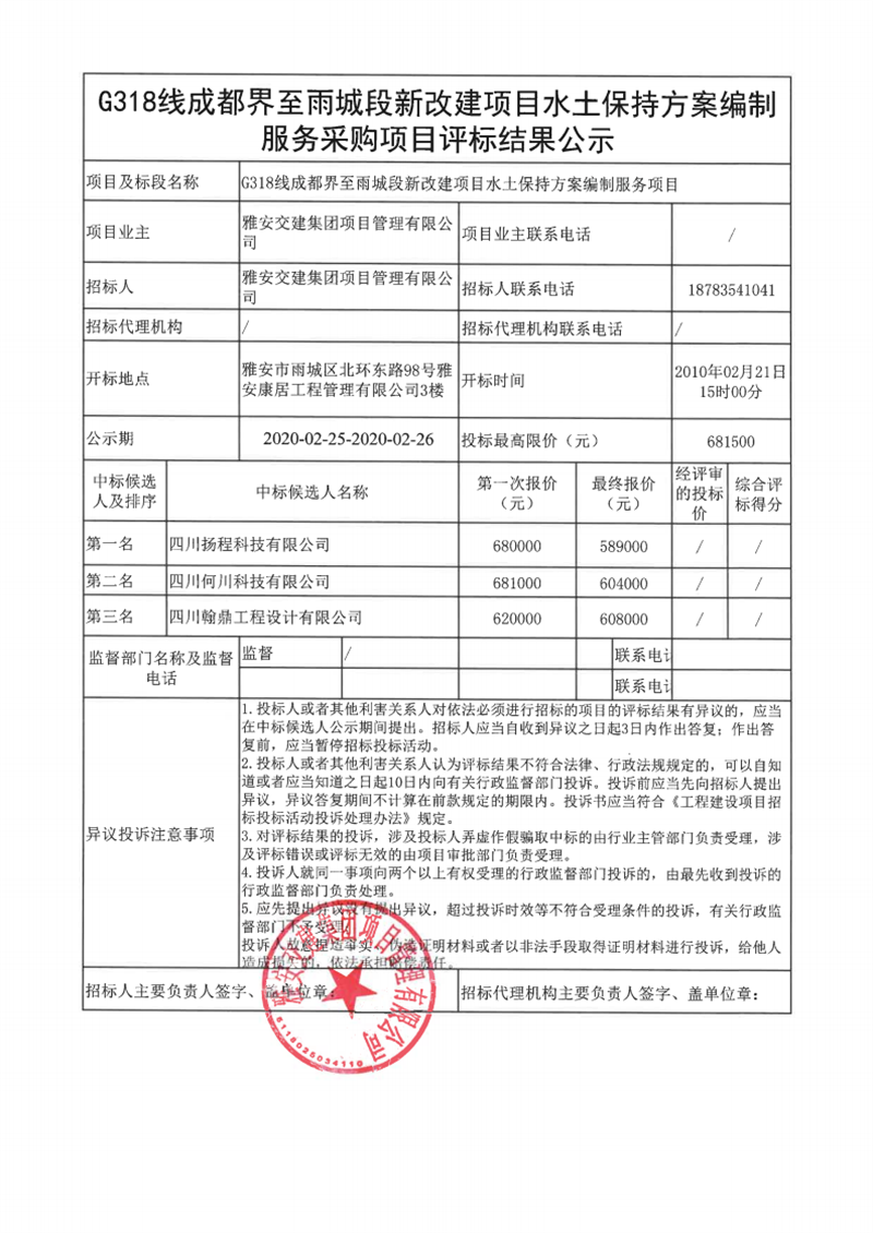 雅安交建集團項目管理有限公司G318線成都界至雨城段新改建項目水土保持方案編制服務采購項目評標結果公示
