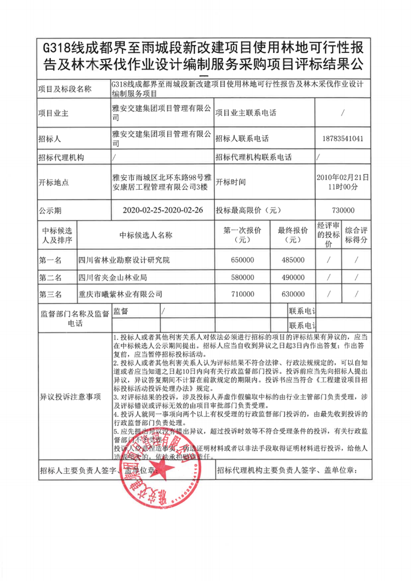 雅安交建集團(tuán)項(xiàng)目管理有限公司G318線成都界至雨城段新改建項(xiàng)目使用林地可行性報(bào)告及林木采伐作業(yè)設(shè)計(jì)編制服務(wù)采購項(xiàng)目評(píng)標(biāo)結(jié)果公示