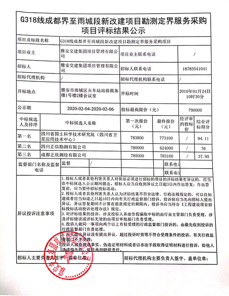 雅安交建集團(tuán)項(xiàng)目管理有限公司G318線成都界至雨城段新改建項(xiàng)目勘測定界服務(wù)采購項(xiàng)目評標(biāo)結(jié)果公示