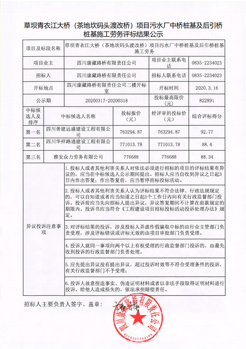 四川康藏路橋有限責(zé)任公司草壩青衣江大橋(茶地坎碼頭渡改橋)項目污水廠中橋樁基及后引橋樁基施工勞務(wù)評標(biāo)結(jié)果公示