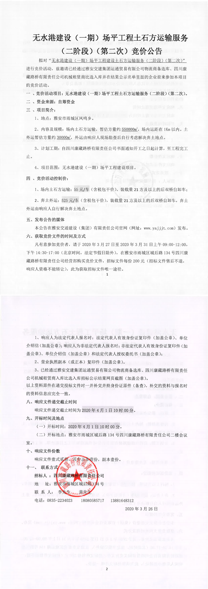 四川康藏路橋有限責(zé)任公司無水港建設(shè)(一期)場平工程建設(shè)土石方運(yùn)輸服務(wù)(二階段)(第二次)競價公告