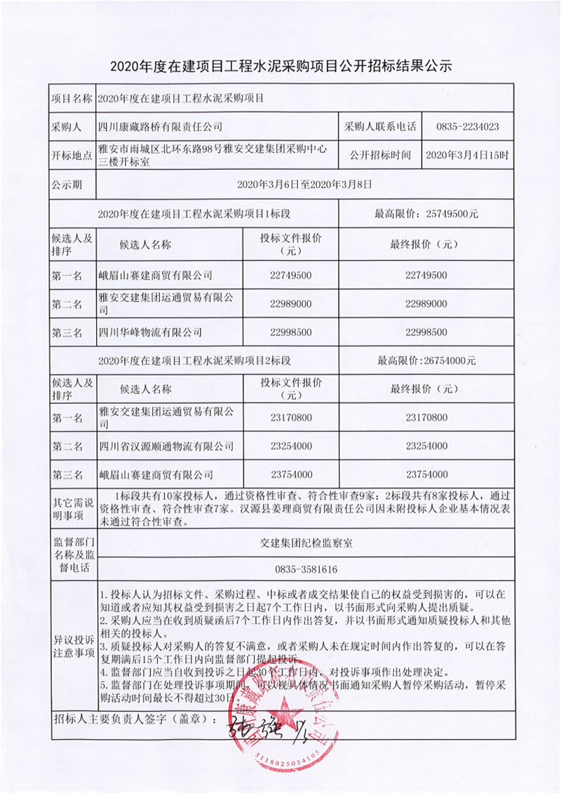四川康藏路橋有限責任公司2020年度在建項目工程水泥采購項目公開招標結果公示