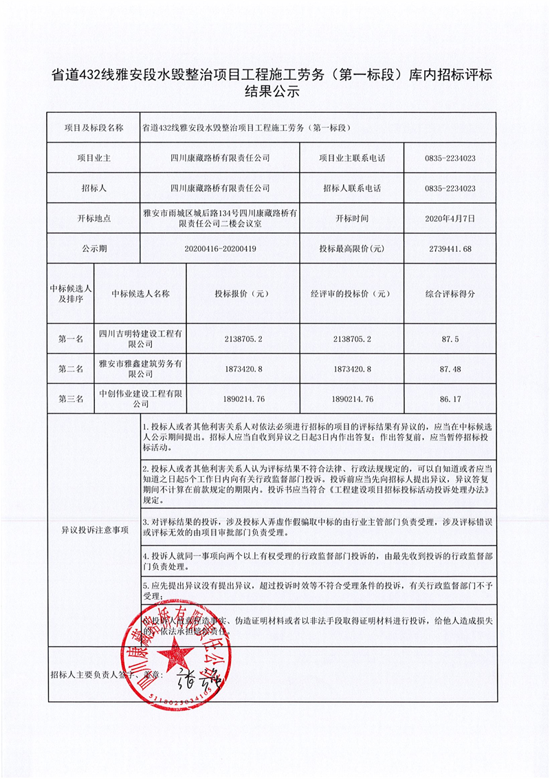 四川康藏路橋有限責(zé)任公司省道432線(xiàn)雅安段水毀整治項(xiàng)目工程施工勞務(wù)(第一標(biāo)段)庫(kù)內(nèi)招標(biāo)評(píng)標(biāo)結(jié)果公示