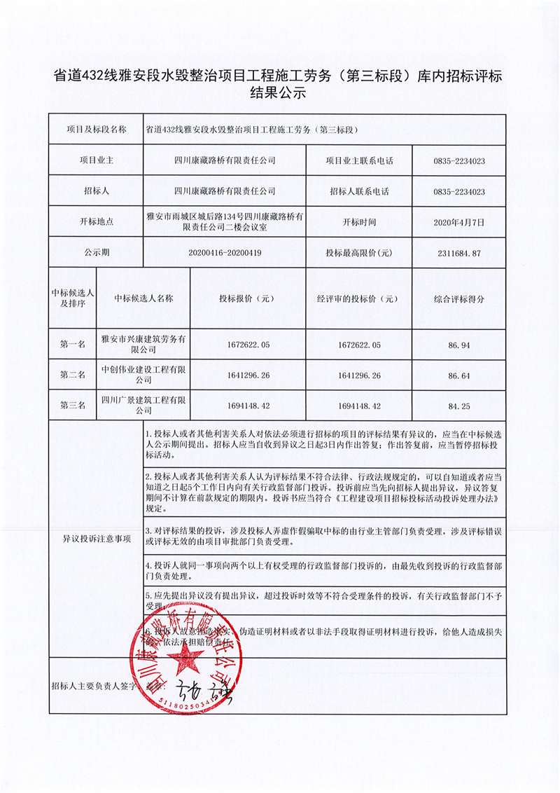 四川康藏路橋有限責(zé)任公司省道432線雅安段水毀整治項(xiàng)目工程施工勞務(wù)(第三標(biāo)段)庫(kù)內(nèi)招標(biāo)評(píng)標(biāo)結(jié)果公示
