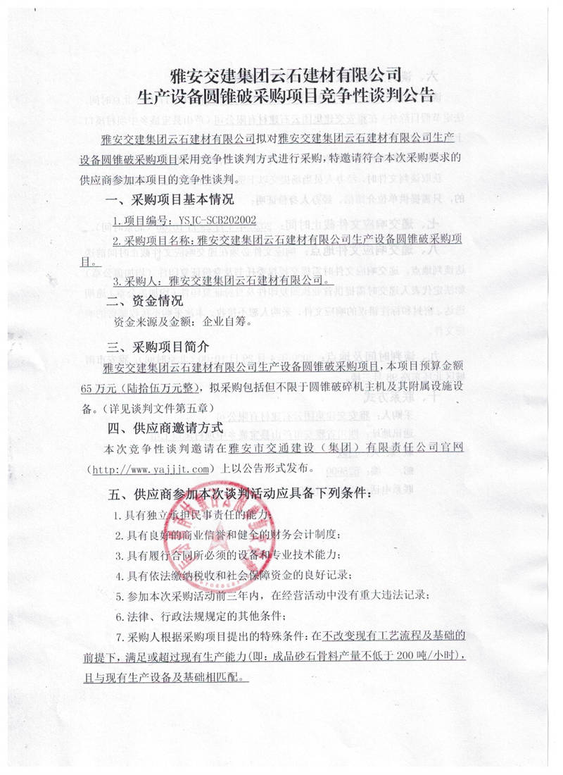 雅安交建集團云石建材有限公司生產(chǎn)設備圓錐破采購項目競爭性談判公告