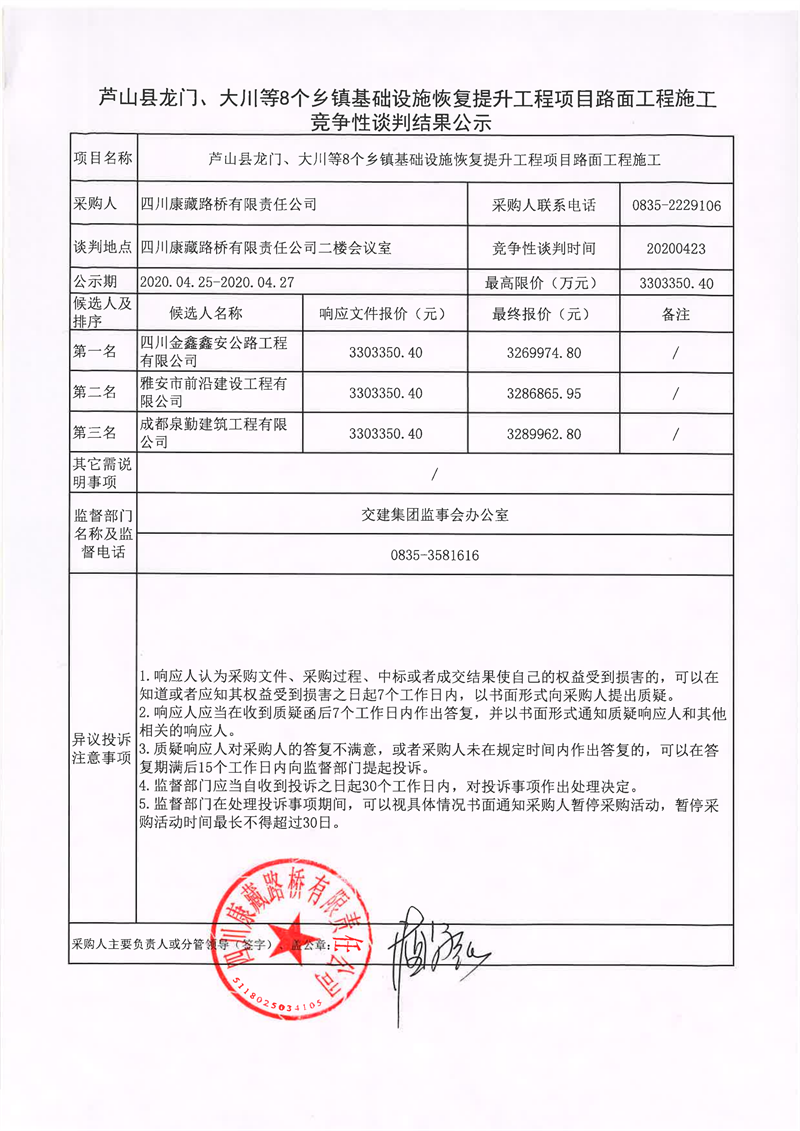 四川康藏路橋有限責任公司蘆山縣龍門、大川等8個鄉(xiāng)鎮(zhèn)基礎(chǔ)設(shè)施恢復(fù)提升工程項目路面工程施工競爭性談判結(jié)果公示