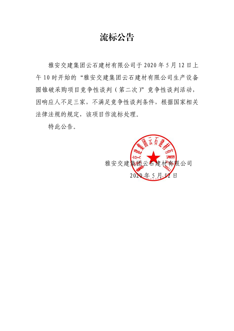 雅安交建集團(tuán)云石建材有限公司生產(chǎn)設(shè)備圓錐破采購項目(第二次)流標(biāo)公告