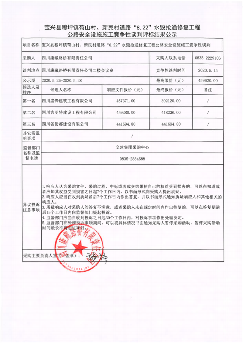 四川康藏路橋有限責任公司寶興縣穆坪鎮(zhèn)茍山村、新民村道路“8.22”水毀搶通修復工程公路安全設(shè)施施工競爭性談判評標結(jié)果公示