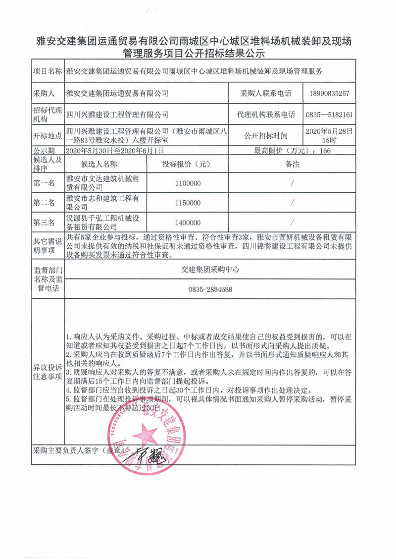 雅安交建集團(tuán)運通貿(mào)易有限公司雨城區(qū)中心城區(qū)堆料場機械裝卸及現(xiàn)場管理服務(wù)項目公開招標(biāo)結(jié)果公示