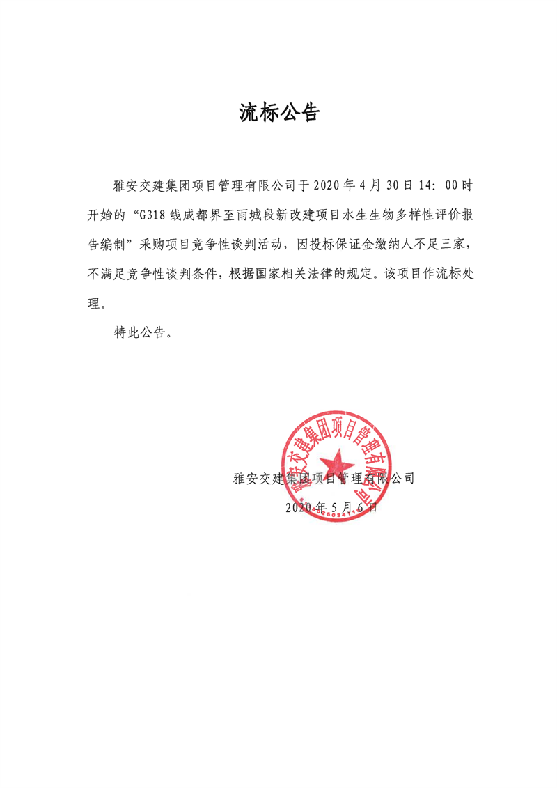 雅安交建集團(tuán)項(xiàng)目管理有限公司G318線成都界至雨城段新改建項(xiàng)目水生生物多樣性評價(jià)報(bào)告編制流標(biāo)公告