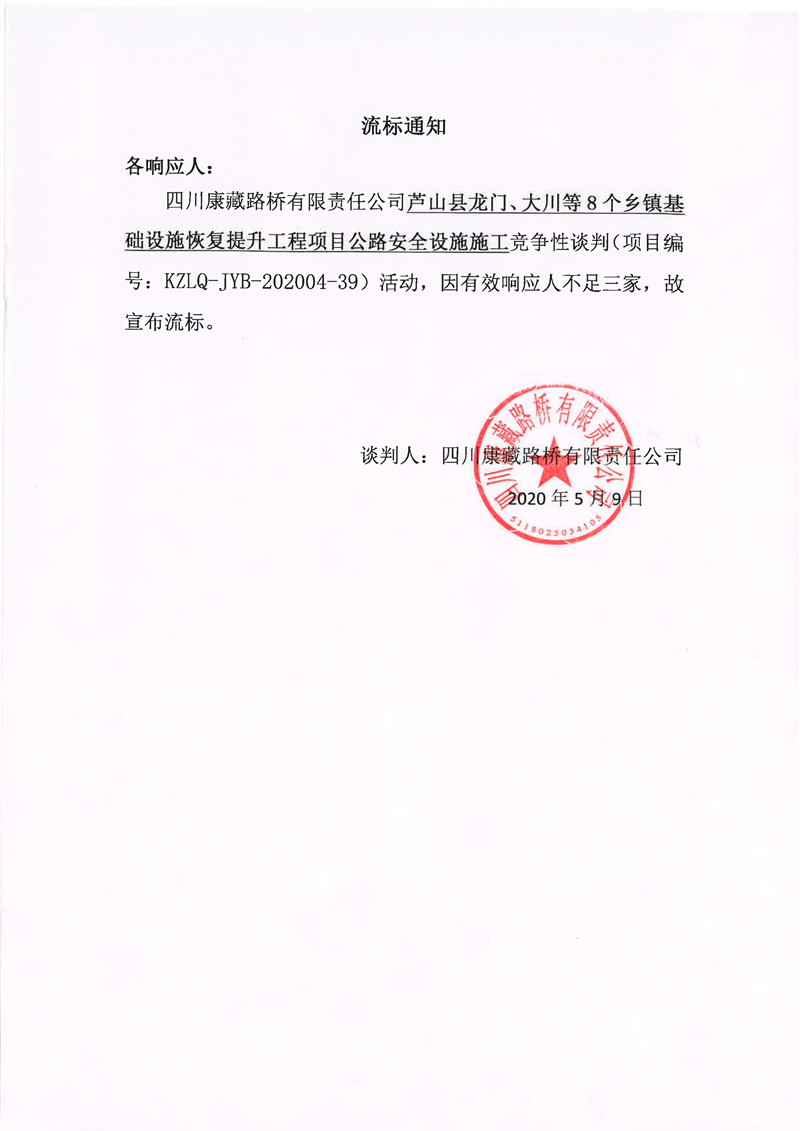 四川康藏路橋有限責任公司蘆山縣龍門、大川等8個鄉(xiāng)鎮(zhèn)基礎(chǔ)設(shè)施恢復提升工程項目公路安全設(shè)施施工競爭性談判流標通知