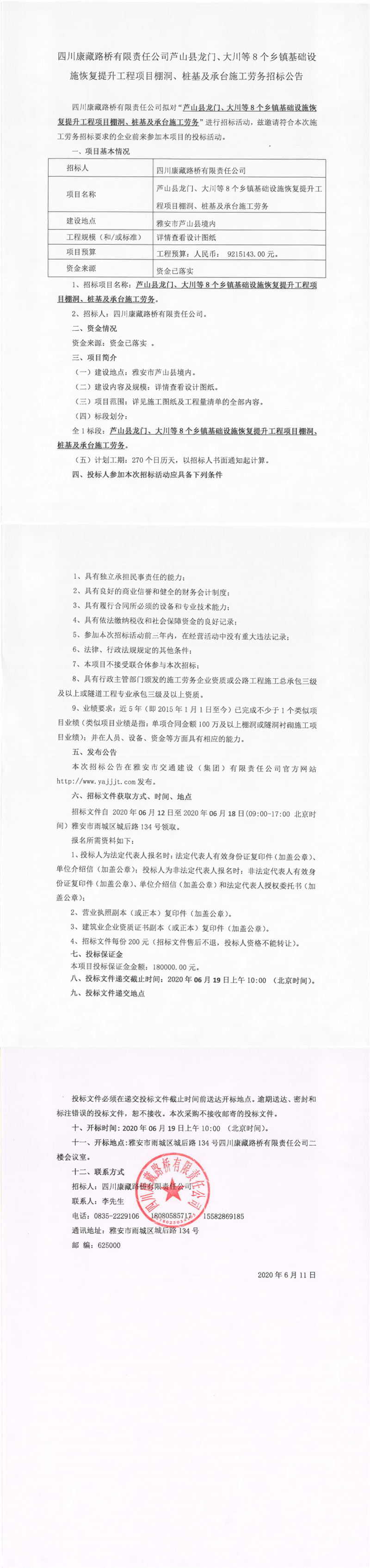 四川康藏路橋有限責任公司蘆山縣龍門、大川等8個鄉(xiāng)鎮(zhèn)基礎設施恢復提升工程項目棚洞、樁基及承臺施工勞務招標公告